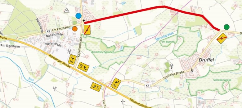 Die Bauarbeiten erstrecken sich über rund 3.100 Meter ab dem Knotenpunkt mit der K7 (Druffeler Straße) in Richtung Rheda-Wiedenbrück. Der genaue Startpunkt wird noch festgelegt. Insgesamt wird eine Fläche von etwa 19.900 Quadratmetern erneuert. Da die Straße zu schmal ist, um während der Bauarbeiten eine Fahrspur offen zu halten, muss die K9 voll gesperrt werden. Umleitungen werden ausgeschildert und führen über die K3, die B64 und die K7.