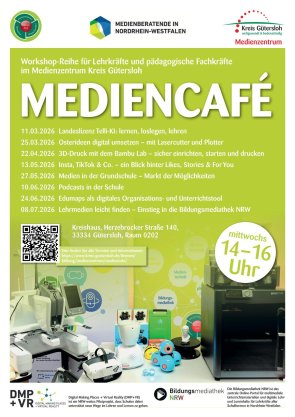 Mit dem Mediencafé bietet das Medienzentrum im Kreis Gütersloh eine anwendungsorientierte Workshop-Reihe für Lehrkräfte und pädagogische Fachkräfte an. Im Mittelpunkt des Angebots steht das Ausprobieren und Kennenlernen von Geräten des NRW-weiten Pilotprojekts Digital Making Places + Virtual Reality (DMP+VR), das durch das Ministerium für Schule und Bildung mit Mitteln aus dem DigitalPakt Schule gefördert wird.