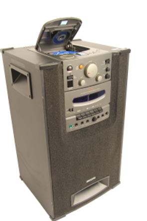 Kassettengerät, CD-Player, Verstärker und Lautsprecher in einem Gehäuse mit seitlichen Griffmulden, 40 Watt Monoverstärker mit 2 - Wege-Lautsprechersystem, Bässe und Höhen könne separat eingestellt werden, Eingänge für 2 Mikrofone und Gitarre, Line In/Out, Kopfhörer (6.3 mm-Klinkenbuchsen), Karaokefunktion, Maße: 320 x 550 x 280 mm (B x H x T), Gewicht 8,5 kg