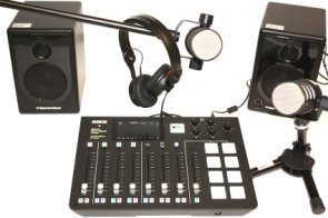 Komplettlösung für Podcasting. Zum Mischpult gehören 2 Mikrofone.