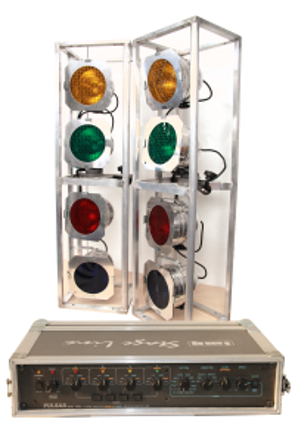 Lichtanlage mit 2 x 4 Scheinwerfern. Lichtsteuerung geeignet für alle Lampentypen mit Niederspannung, Neonlichter etc., 4 komplett dimmbare 5 A Kanäle (max. Leistung 15 A), kann an jeder normalen Steckdose angeschlossen werden.