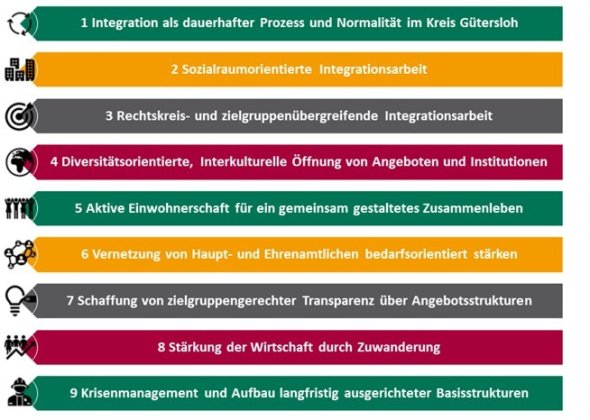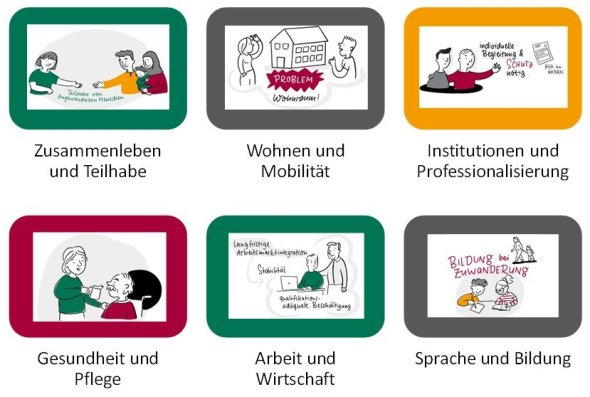 So zeigt das Integrationskonzept neun Kernthemen der Integrationsarbeit sowie sechs zentrale Handlungsfelder auf und bietet zu jedem konkrete Empfehlungen.