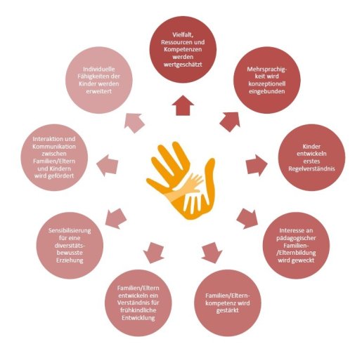 Ziel von Griffbereit ist es, durch frühe Bildung die Grundlage für Mehrsprachigkeit zu schaffen und die allgemeine Entwicklung bei 1-3-jährigen Kindern zu fördern. Hierfür stehen Elternmaterialien in über 20 Sprachen zur Verfügung. Die Gruppe wird von einer ausgebildeten, mehrsprachigen Elternbegleitung geleitet. Trotz thematischer Anregungen in Form von umfangreichen Handbüchern und Material ist das Programm offen und flexibel. Die Umsetzung ist mit verschiedenen pädagogischen Konzepten und alltagsintegrierter Sprachbildung kompatibel.